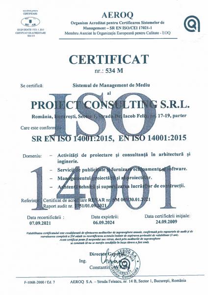 - Sistemul de managment de mediu SR EN ISO 14001:2005, EN ISO 14001:2015.